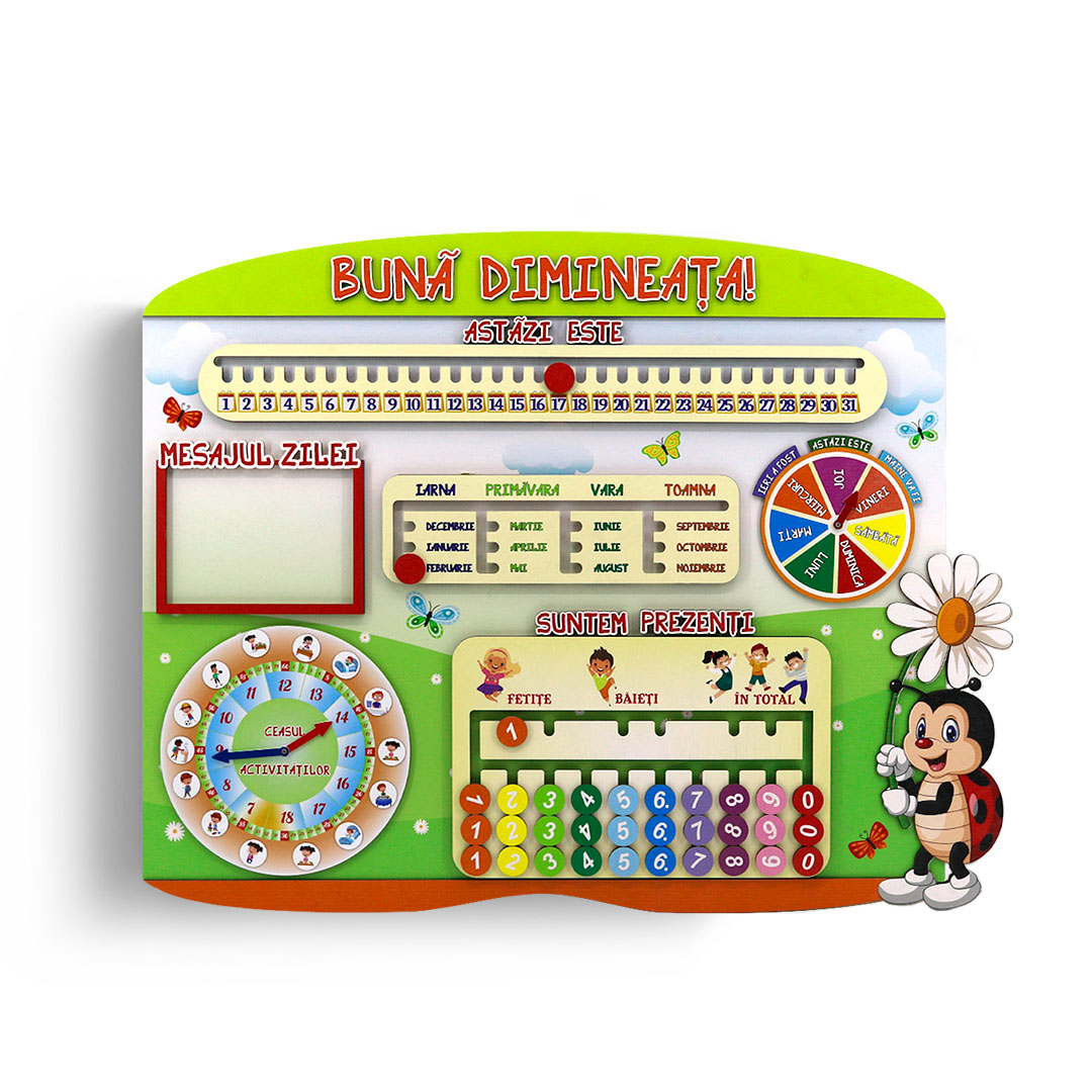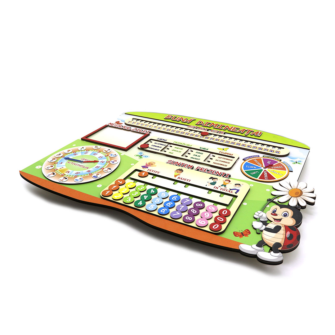 The wooden panel is intended for kindergartens for daily records of children's presence, checking calendar items such as time, date, days of the week, month and for organizing current day activities.