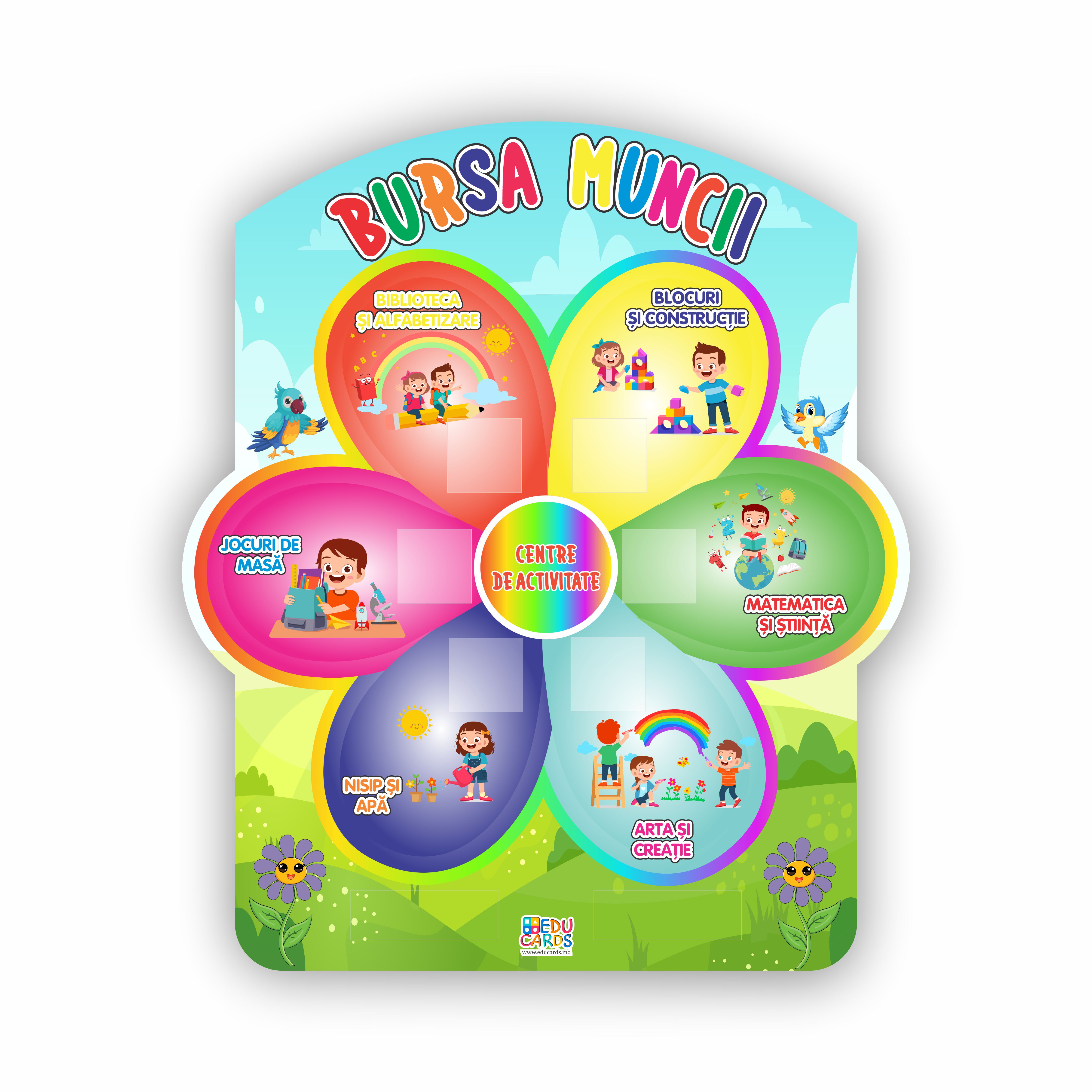 Panou educativ „Bursa Muncii” – un material didactic ideal pentru organizarea centrelor de activitate și dezvoltarea responsabilității la copii. Panoul ajută educatorii să gestioneze ușor activitățile zilnice prin implicarea preșcolarilor în sarcini specifice. Recomandat pentru grădinițe, creșe și clase pregătitoare.