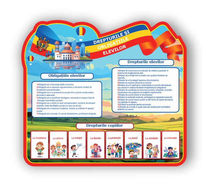 Panoul „Drepturile și obligațiile elevilor” este un material educativ esențial pentru școli și grădinițe. Acesta ajută elevii să înțeleagă clar care sunt drepturile lor fundamentale, dar și responsabilitățile pe care trebuie să le respecte în mediul școlar. Ilustrațiile atractive și informația structurată ușor de urmărit fac panoul ideal pentru sălile de clasă sau coridoare. Promovează respectul, responsabilitatea și spiritul civic în rândul copiilor și adolescenților.