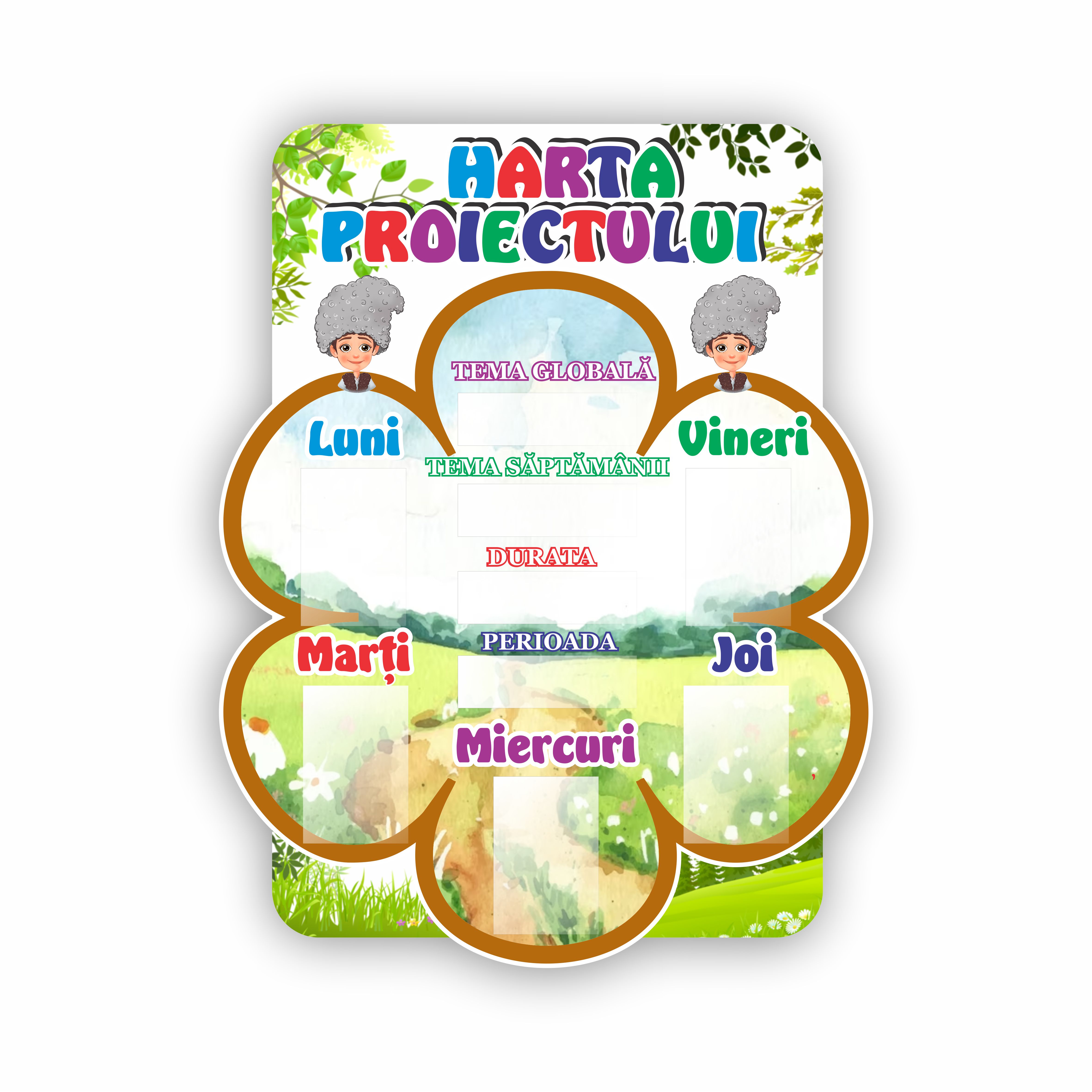 Harta Proiectului este un panou educațional modern, conceput pentru grădinițe și clasele primare, care ajută la organizarea temelor și activităților săptămânale. Cu un design vesel și structurat, include spații pentru tema globală, tema săptămânii, durata, perioada și activități pentru fiecare zi (luni–vineri). Este un instrument didactic eficient, care sprijină planificarea vizuală și implicarea activă a copiilor în procesul de învățare. Ideal pentru cadrele didactice care folosesc metode interactive și tematice.