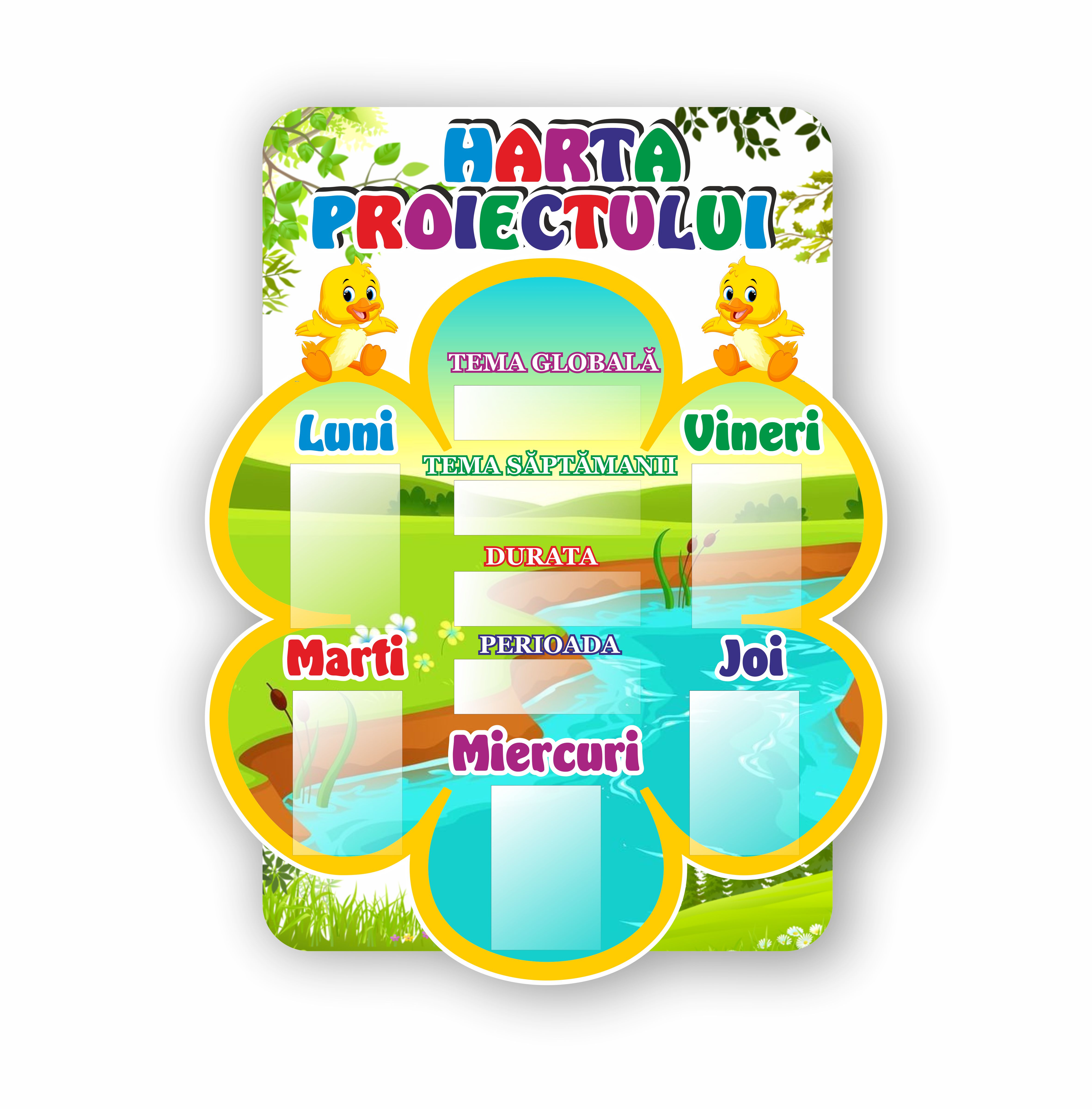 Harta Proiectului este un panou educațional modern, conceput pentru grădinițe și clasele primare, care ajută la organizarea temelor și activităților săptămânale. Cu un design vesel și structurat, include spații pentru tema globală, tema săptămânii, durata, perioada și activități pentru fiecare zi (luni–vineri). Este un instrument didactic eficient, care sprijină planificarea vizuală și implicarea activă a copiilor în procesul de învățare. Ideal pentru cadrele didactice care folosesc metode interactive și tematice.