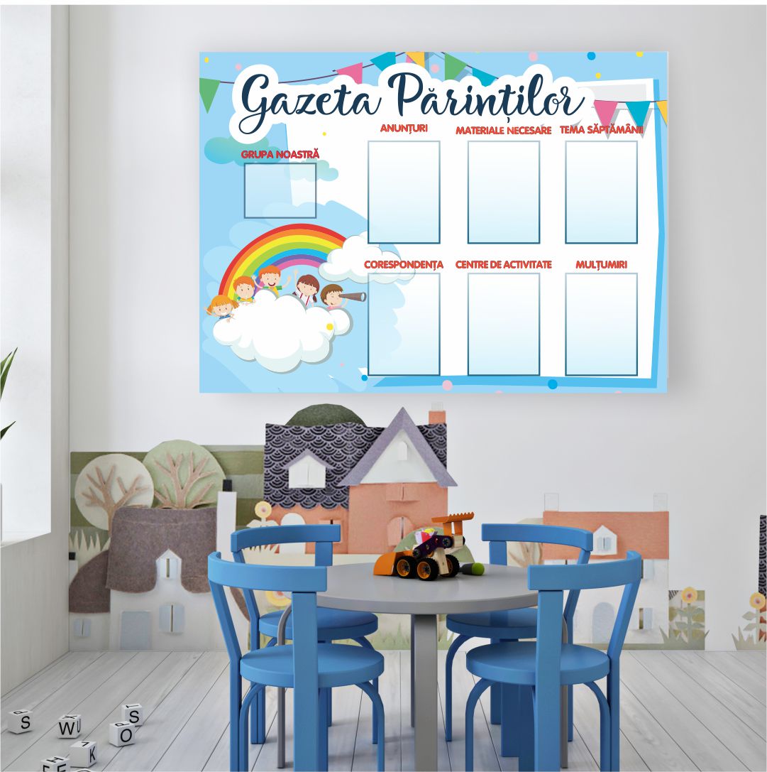 Panou informativ pentru instituții de învățământ, cu tehnica de imprimare UV directă pe material și cu buzunare dimensiune A4.