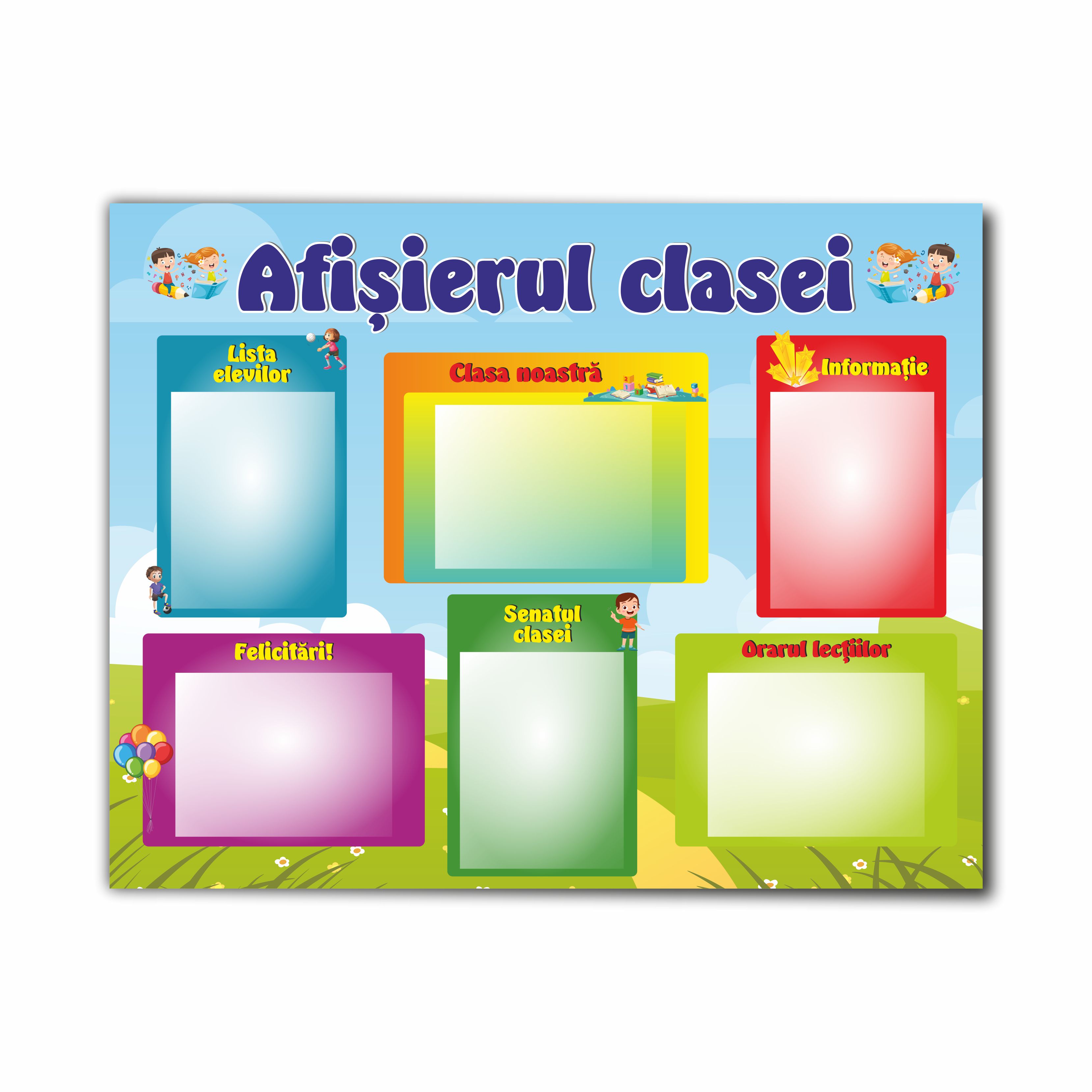 Panou informativ pentru instituții de învățământ, cu tehnica de imprimare UV directă pe material și cu buzunare dimensiune A4.