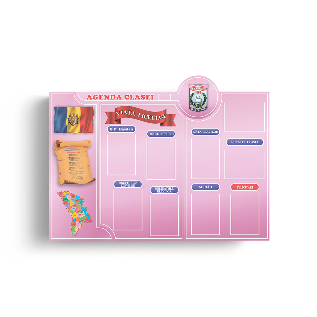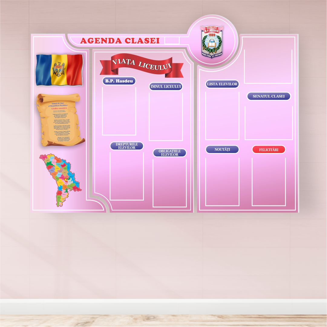 Panou informativ pentru instituții de învățământ, cu tehnica de imprimare UV directă pe material și cu buzunare dimensiune A4.