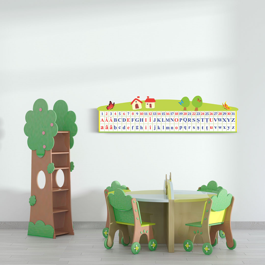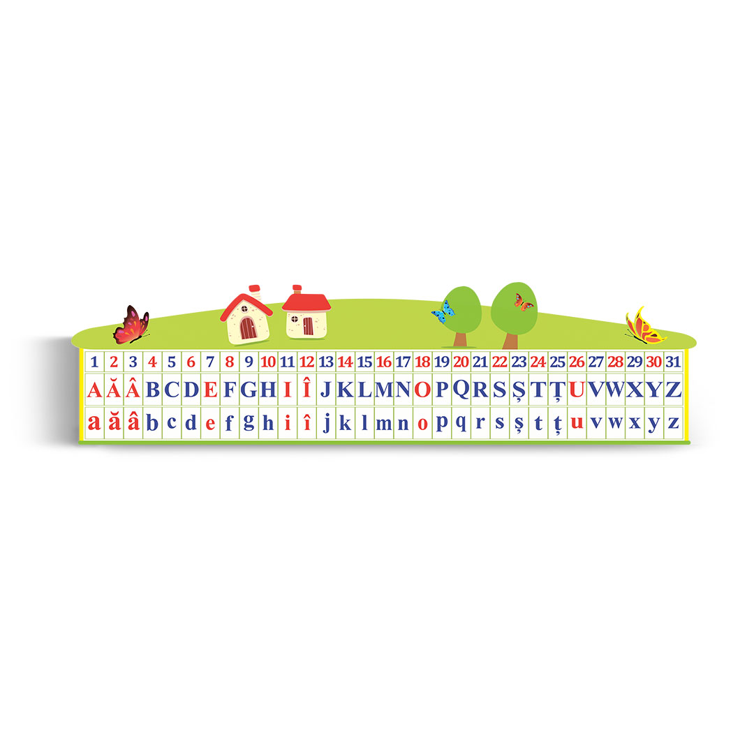 Panoul din lemn conține 31 litere ale alfabetului român cu scrierea de tipar și numerele de la 1 la 31.