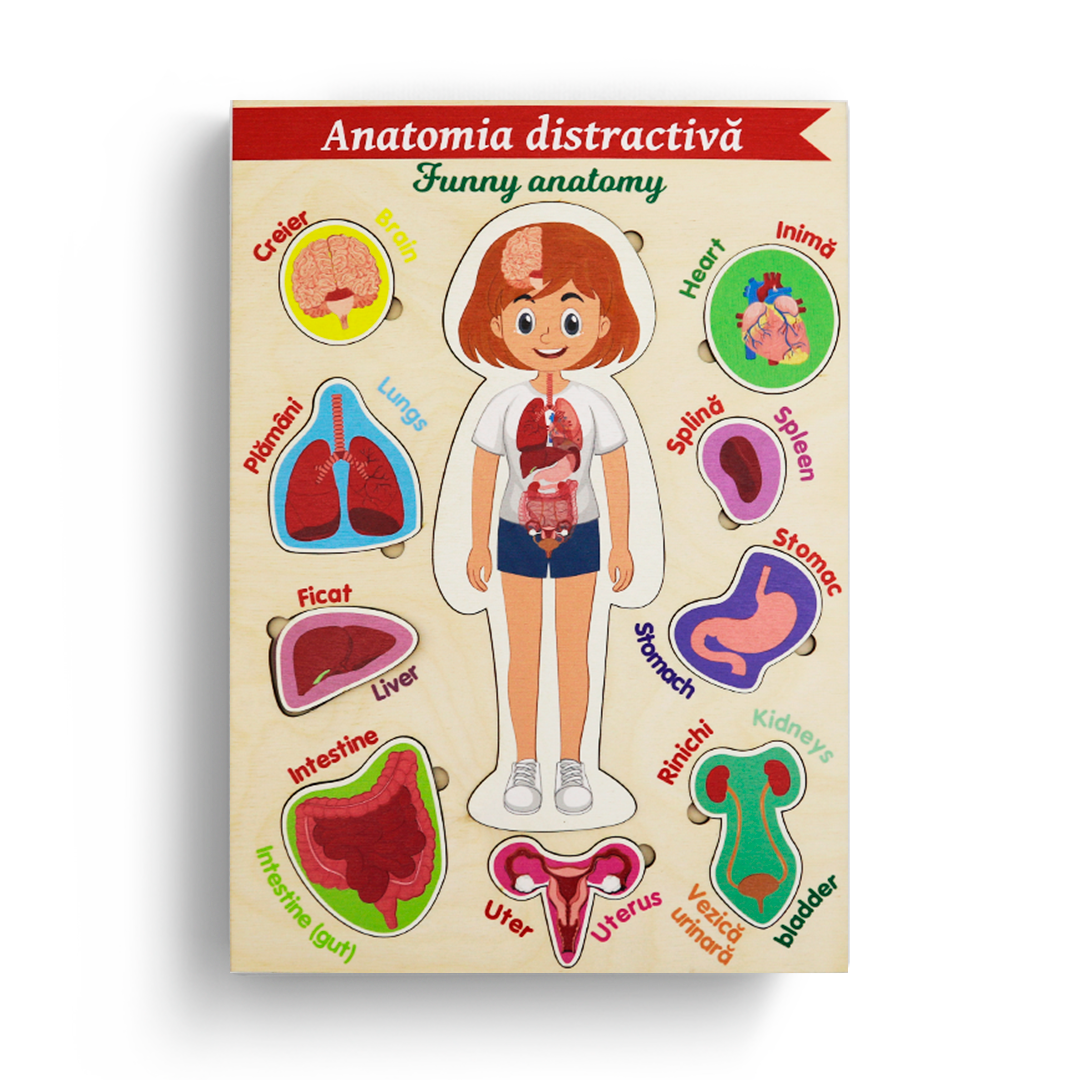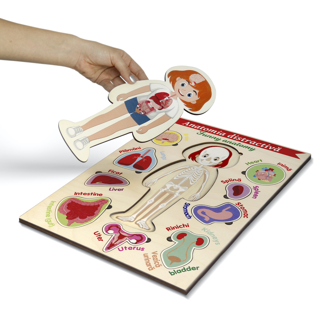 Acest puzzle din lemn este un joc superb cu ajutorul căruia copii vor învață organele interne, funcțiile și poziția lor în corp. Jocul este atât distractiv, cât și util în cunoașterea corpului omenesc și în dezvoltarea memoriei, atenției și abilităților motorice fine.