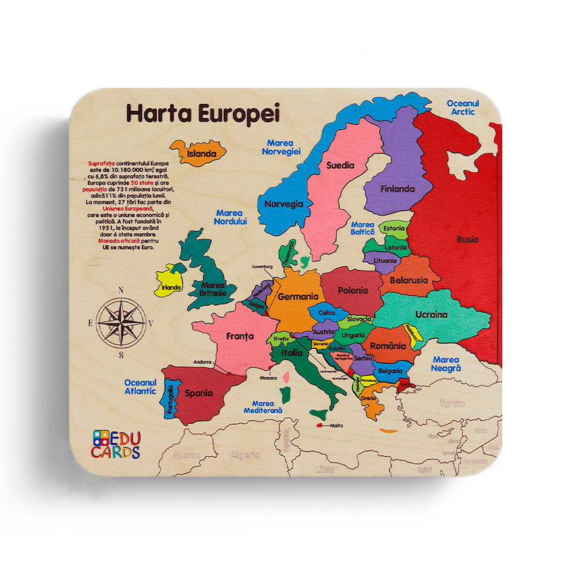 Puzzle “Harta Europei” este un joc educativ și creativ perfect pentru cei mici cu ajutorul căruia vor invăța, într-un mod ușor și interesant, geografia continentului și organizarea teritorial-administrativă.