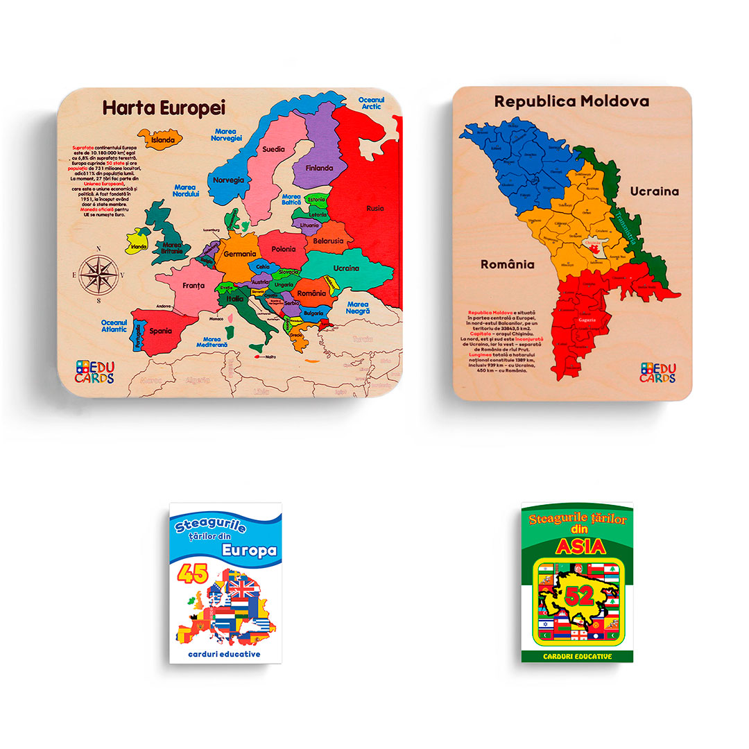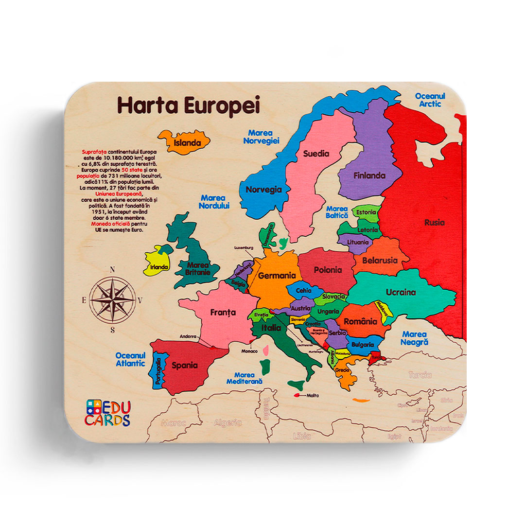 Puzzle “Harta Europei” este un joc educativ și creativ perfect pentru cei mici cu ajutorul căruia vor invăța, într-un mod ușor și interesant, geografia continentului și organizarea administrativă.